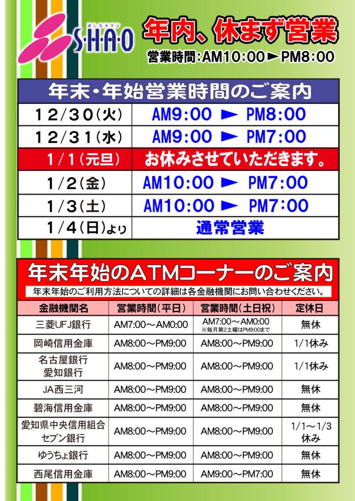 | ■1F外 ヘアカットイム | ●2025年12月31日(水) 9:00~16:00まで ●2026年1月1日(元旦)~2026年1月3日(土) お休み |