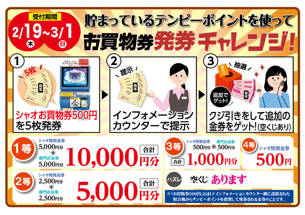 期間中、シャオお買い物券500円(有効期限内の物に限ります)を5枚ご提示いただくと1等10,000円分の金券が当たるスクラッチくじににチャレンジいただけます。