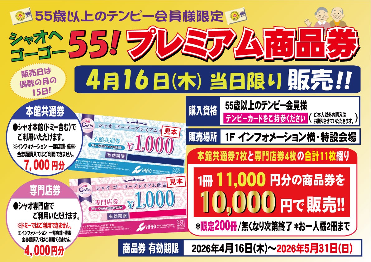 <55歳以上のテンピー会員様限定> ゴーゴープレミアム商品券販売