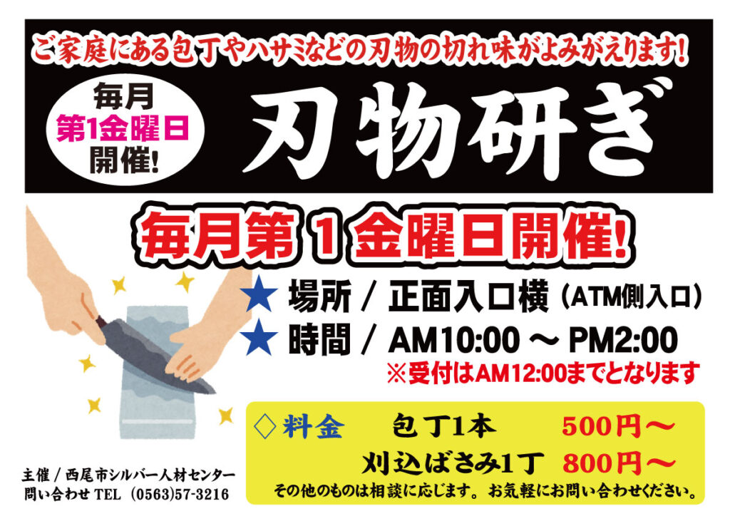 / 最終更新日時 : niimi@ipg.ne.jp 【刃物研ぎコーナー】 期間:2月6日(金) 場所:ATM側入口横 時間:AM10:00~PM2:00 ※受付はAM12:00まで ※気温によって中止となる場合がございます 主催:西尾市シルバー人材センター (0563)57-3216
