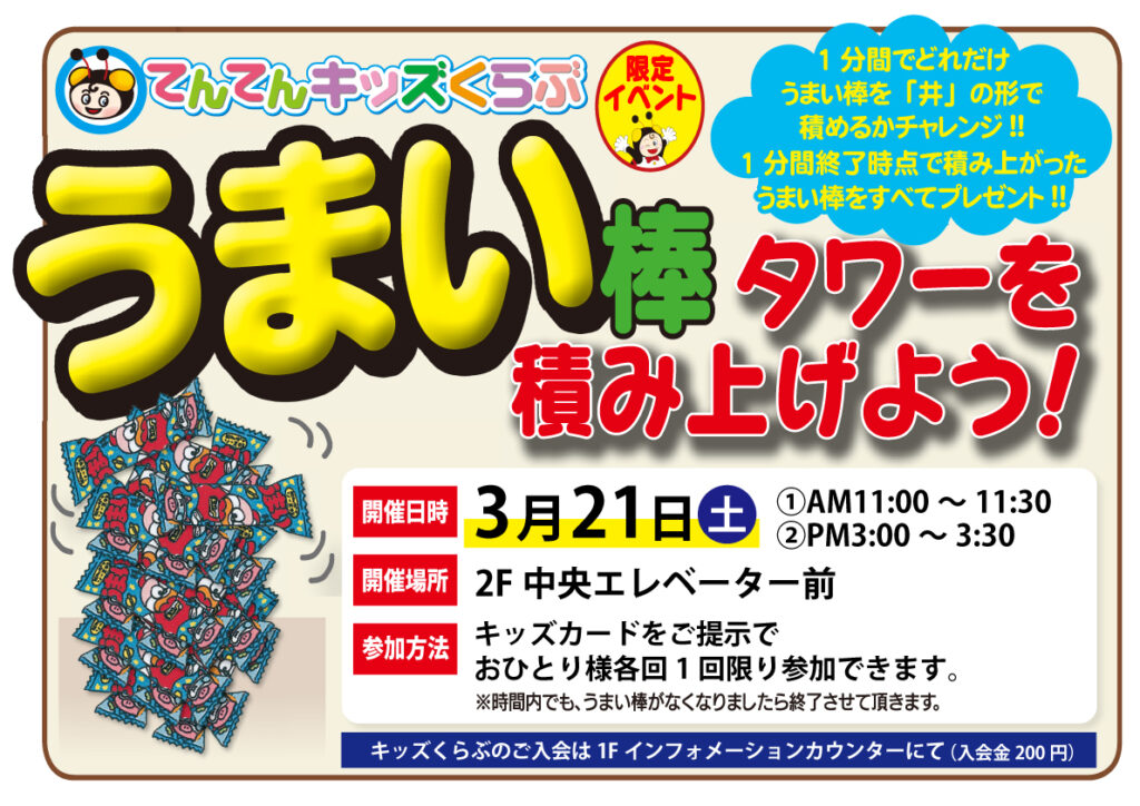 / 最終更新日時 : niimi@ipg.ne.jp 【<キッズイベント> うまい棒タワー】 実施日:3月21日(土) 時間:1回目AM11:00~11:30 / 2回目PM3:00~3:30 場所:2F中央エレベーター前 参加方法:キッズカードご提示でおひとり様1回まで 内容:1分間でうまい棒を井の形に積み上げよう!1分経過時点で積みあがった分のうまい棒をプレゼント!